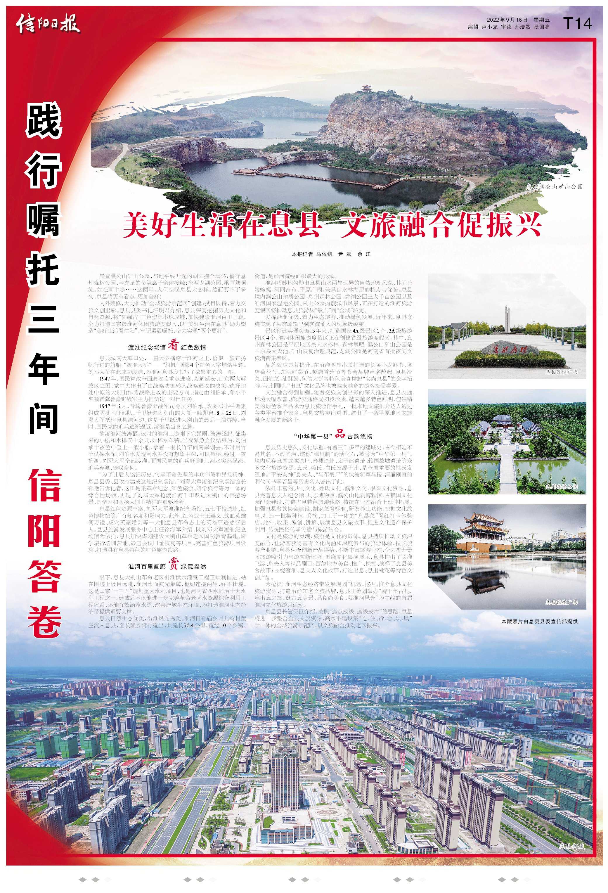 内外兼修,大力推动“全域旅游示范区”创建;拭目以待,着力交旅文创出彩。息县县委书记汪明君介绍,息县深度挖掘历史文化和自然资源,将“红绿古”三色资源串珠成链,加快建设淮河百里画廊,全力打造国家级淮河休闲旅游度假区,以“美好生活在息县”助力塑造“美好生活看信阳”,牢记殷殷嘱托,奋力实现“两个更好”。