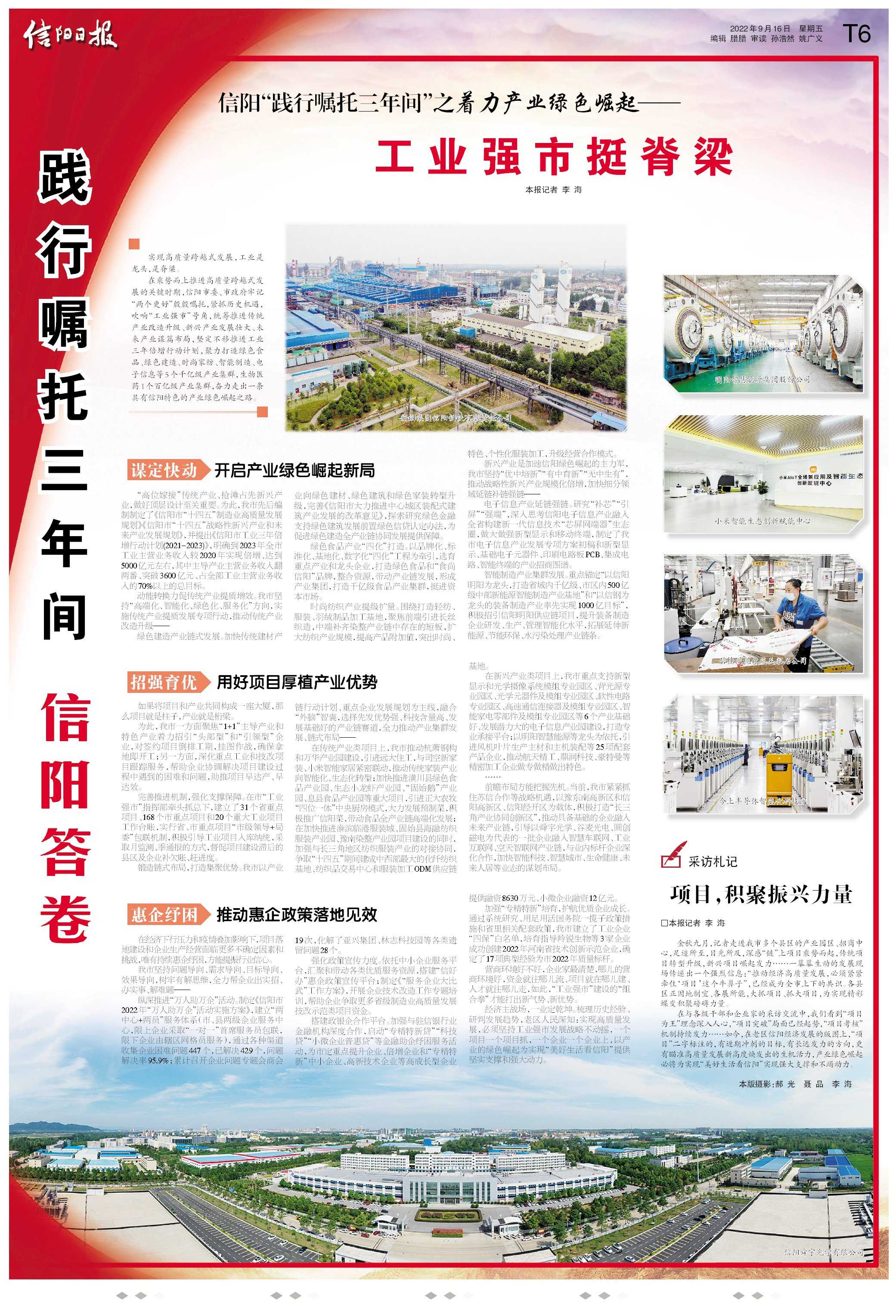 在与各级干部和企业家的采访交流中,我们看到“项目为王”理念深入人心,“项目突破”局面已经起势,“项目考核”机制持续发力……如今,在老区信阳经济发展的版图上,“项目”二字标注的,有近期冲刺的目标,有长远发力的方向,更有瞄准高质量发展新高度焕发出的生机活力,产业绿色崛起必将为实现“美好生活看信阳”实现强大支撑和不竭动力。