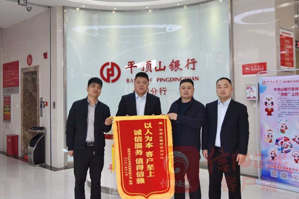 11月28日,信阳市天汇发展投资有限公司负责人一行,将一面写着“以人为本、客户至上、诚信服务、值得信赖”的锦旗赠予平顶山银行信阳分行,对该行长期以来支持上天梯管理区及天汇公司发展表示诚挚谢意。
