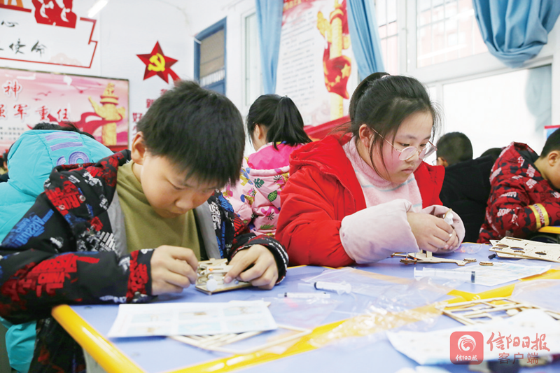 12月17日下午4时,记者来到信阳市第三小学。走进其中一个教室,看到孩子们正4人一组,对照着图纸,认真地拿着小零件在组装,原来他们正在进行科技模型制作。“周五我们开设的是‘一班一品’多彩课堂。”信阳市第三小学校本教研室副主任王黎明对记者说,“周一、周三、周四是‘基础课程’,周二是‘特色社团’。”
