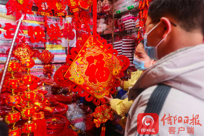 1月23日,群众在光山县公安街市场内选购新年饰品。春节临近,喜庆饰品俏销,大家纷纷选购年画、“福”字、红灯笼、中国结等喜庆饰品,红红火火迎接新的一年。谢万柏 摄