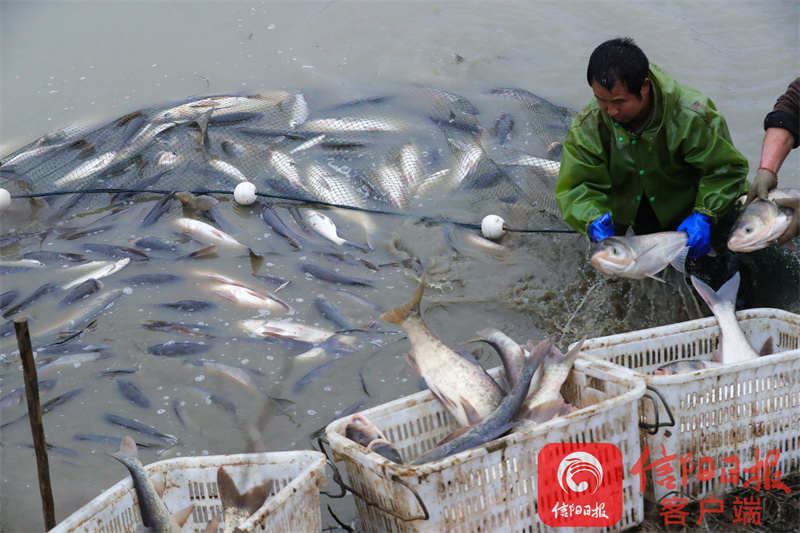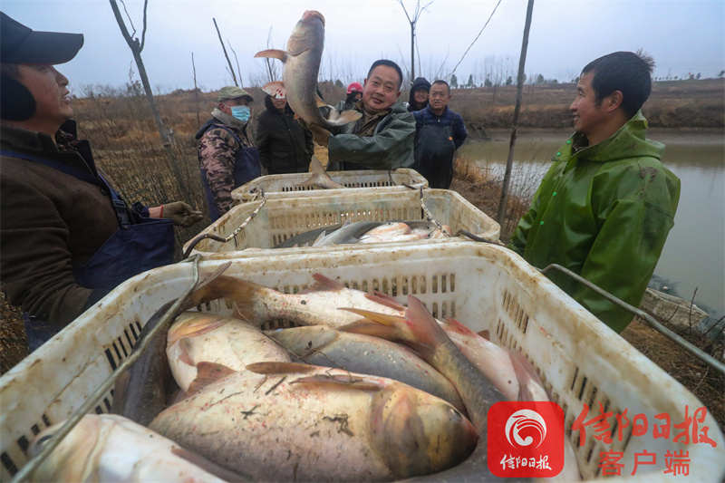 1月18日,光山县砖桥镇李岗村昌盛农业专业合作社社员正在叶大堰里捕鱼。人欢鱼跃庆丰收,年年有鱼福气来。谢万柏 摄