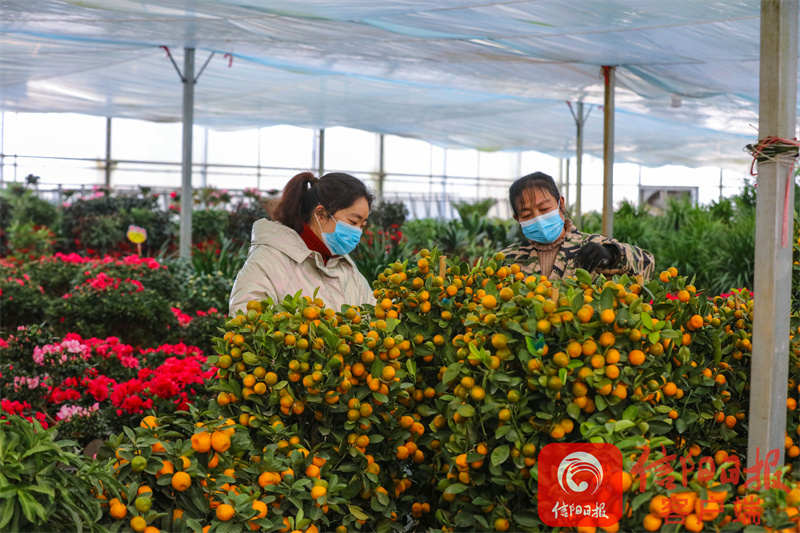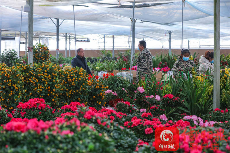 1月16日,光山县紫水街道前楼村光明鲜花盆景园内,花农正在帮助市民选购鲜花。谢万柏 摄