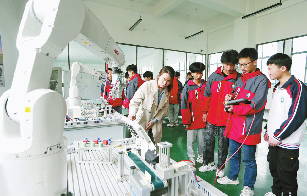 3月19日,罗山县中等职业学校的学生们在教师指导下进行智能制造工业机器人实训。近年来,该校充分发挥职业教育在技能人才培养中的优势,拓展引进了汽车维修、3D打印、无人机、工业机器人、机电一体化等紧贴市场需求的合作专业,建有智能制造、新能源汽车、电商等30余个专业实训基地(实训室),实现了办学条件标准化、教学手段现代化、学校管理规范化。