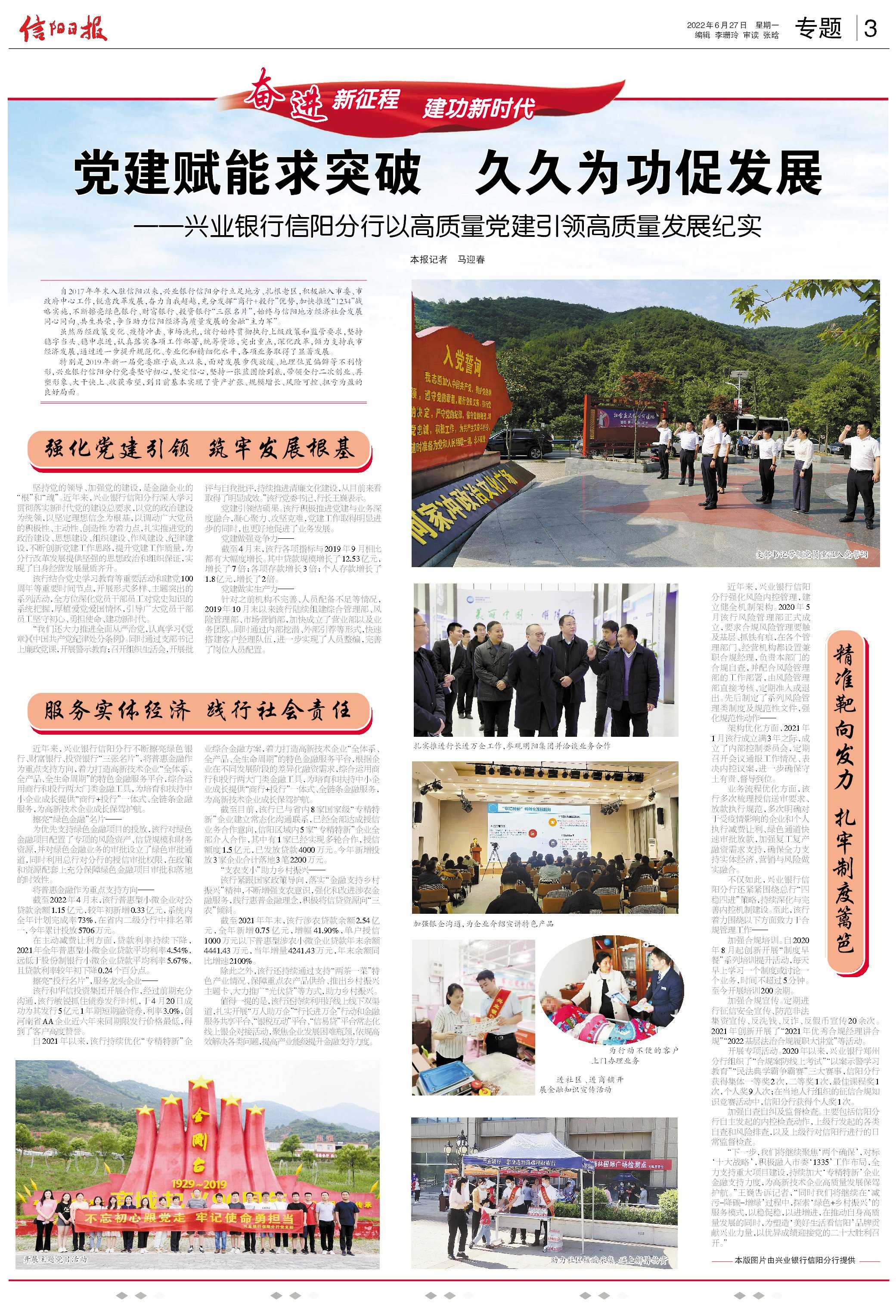 坚持党的领导、加强党的建设,是金融企业的“根”和“魂”。近年来,兴业银行信阳分行深入学习贯彻落实新时代党的建设总要求,以党的政治建设为统领,以坚定理想信念为根基,以调动广大党员的积极性、主动性、创造性为着力点,扎实推进党的政治建设、思想建设、组织建设、作风建设、纪律建设,不断创新党建工作思路,提升党建工作质量,为分行改革发展提供坚强的思想政治和组织保证,实现了自身经营发展量质齐升。