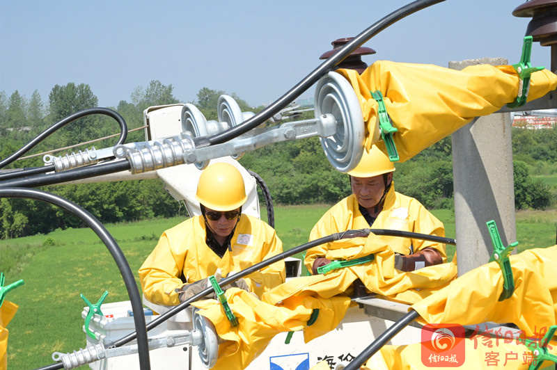 地表温度超过45度,空中作业温度接近50度,头戴厚重安全帽,身着密不透风的黄色绝缘服,手戴绝缘手套,连日来,在烈日“烤”验下,国网信阳供电公司一线电力工人坚持带电作业,保障群众用电可靠供应。