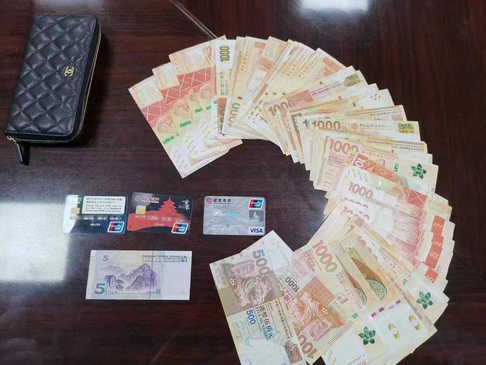 原来就在7月5日14时,刘柯兵在信阳东站售票厅门口巡逻时,捡拾到一黑色名牌手包。在现场寻找失主无果后,便带回公安岗亭查验登记,竟发现包内装有3张银行卡,1张500元面值港币和39张1000元面值港币。考虑到失主丢失财物的焦急心情,民警立刻出动走访周边旅客,同时联系信阳东车站服务台,与登记的丢失包裹信息逐一进行核对,但均未获得有效信息。