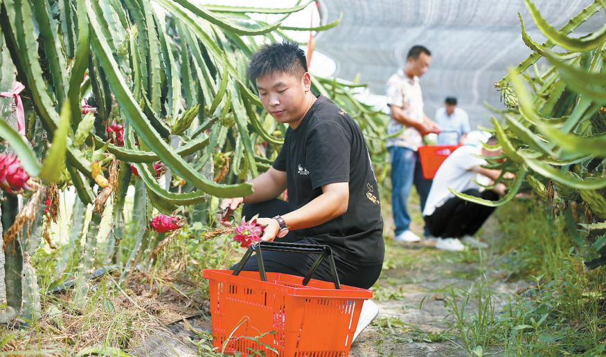 夏日炎炎,正值火龙果成熟采摘期,鸡公山管理区金鹏生态园的火龙果迎来丰收。生态园负责人王鹏今年23岁,大学毕业后响应村“两委”号召返乡创业,建成200余亩的基地,以种植火龙果、猕猴桃、花椒为主,带动村里近30名脱贫户务工增收。下一步,该生态园所在的大王村将按照乡村振兴布局融合发展,利用现有旅游资源实施特色种植、旅游产品开发,深度打造乡村旅游示范区。