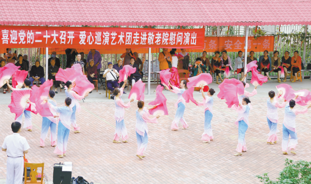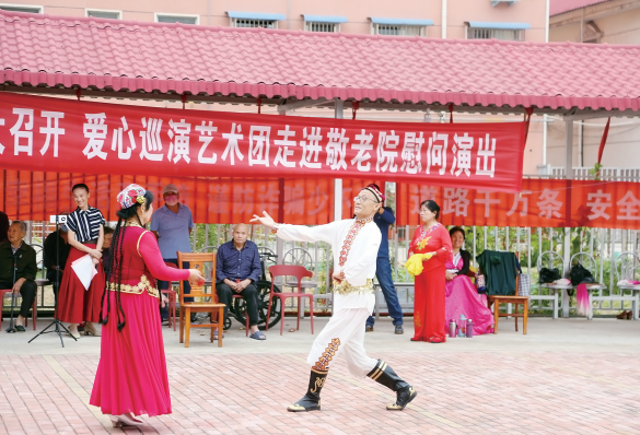 临近十月一日国庆节,信阳爱心巡演艺术团以弘扬传统文化和反映时代风貌为核心,准备了一场场丰富多彩的文艺节目,为多个乡村、社区的老人们送去欢乐,丰富社区群众精神文化生活的同时,收获满满的幸福感。图为昨日艺术团演员们为福康养老院的老人们表演欢快的舞蹈。