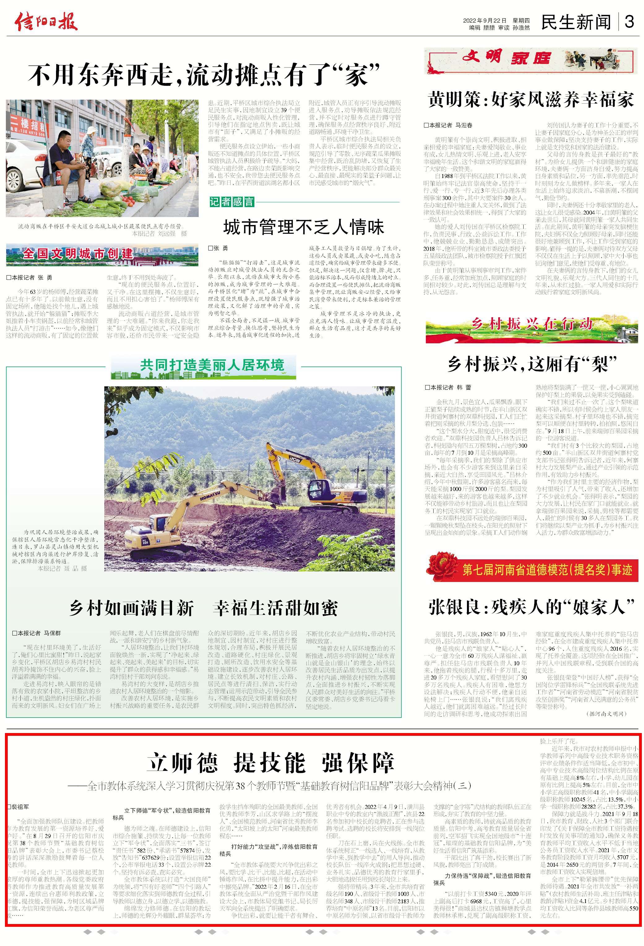 “全面加强教师队伍建设。把教师作为教育发展的第一资源培养好、爱护好。”在8月29日召开的信阳市庆祝第38个教师节暨“基础教育树信阳品牌”表彰大会上,市委书记蔡松涛的讲话深深激励鼓舞着每一位人民教师。