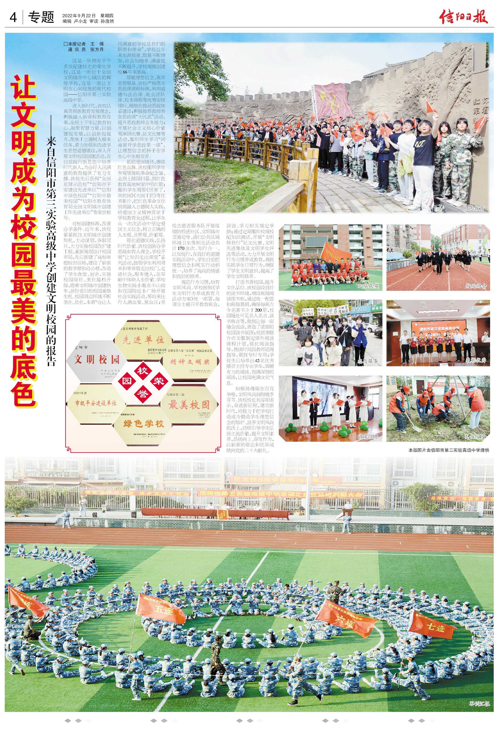 培根铸魂催生百花争艳,文明风尚润得桃李芬芳。该校校长刘春阳表示,奋进新征程,建功新时代,将致力于把学校打造成为锻造学生理想信念的熔炉、滋养文明风尚的沃土,持续引导学生弘扬主流价值,提升文明素养,昂扬向上、奋发作为,以崭新的姿态和优异成绩向党的二十大献礼。(本文图片由信阳市第三实验高级中学提供)