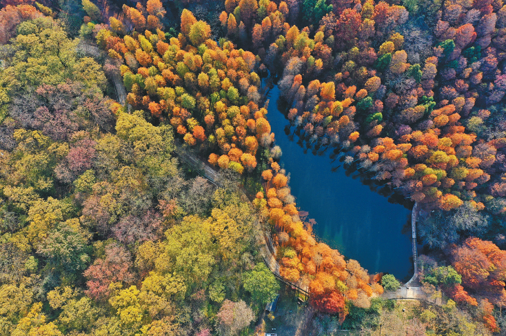白露过后,仲秋微凉。鸡公山脚下有一脉青山,望之蔚然而深秀。这就是波尔登森林公园。9月21日,到波尔登森林公园泡“氧吧”,这里是每立方厘米9万个负氧离子的神奇存在地;这里野生动植物繁多,是不可多得的动植物物种“基因库”。在林野深处,在静谧湖边,汲取香甜空气,漫步在波尔登森林公园,重新找回年轻的自己。沿着步道前行,波尔登森林公园,茗湖边,如画美景令人应接不暇。这里有秋天最早红的树叶——五角枫,这里还生长着成片的池杉。深秋,树叶渐红,波尔登森林公园进入“调色盘”模式,褪去青涩的绿,换上火红的衣,在这里,拍照都不需滤镜。然而,惊艳之景往往昙花一现。从每年11月初至12月初,短暂30天,波尔登森林公园释放了深秋最浓艳的“烟火”,点燃四野来迎接漫长的冬季。