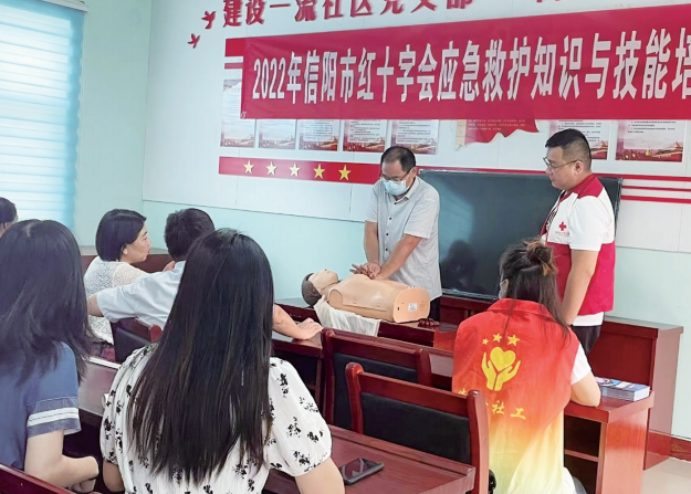 为提高广大居民的应急救护知识,提升应对突发事件和意外伤害事故的应急救援和自救互救能力,近日,羊山新区羊山街道前卫社区开展2022年信阳市红十字会应急救护知识与技能培训活动。图为活动现场。王瑞 摄
