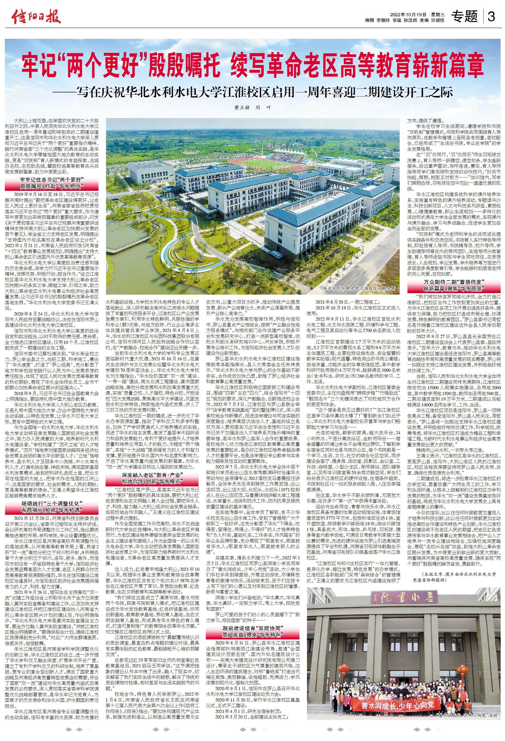 作为全国党建工作示范高校,华水不忘启迪新时代大学生红色精神,与大别山革命老区并肩同行,为老区建设培养德智体美劳全面发展的社会主义建设者和接班人;作为全国唯一的以水利水电命名大学,华水主动把自身发展融入国家经济社会发展之中,为信阳努力培养新时代水利水电建设者,为革命老区高质量发展提供人才支撑。