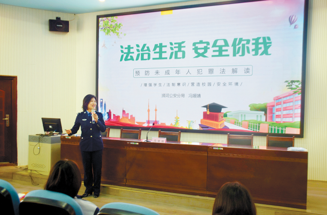 11月21日,市第一高级中学邀请浉河区公安分局干警向学生上了一节题为“法治生活安全你我预防未成年人犯罪法解读”的法治课。讲座通过翔实的校园事故典型案例分析,提高了学生们依法保护自身合法权益的能力意识,增强其安全意识和自我保护意识。