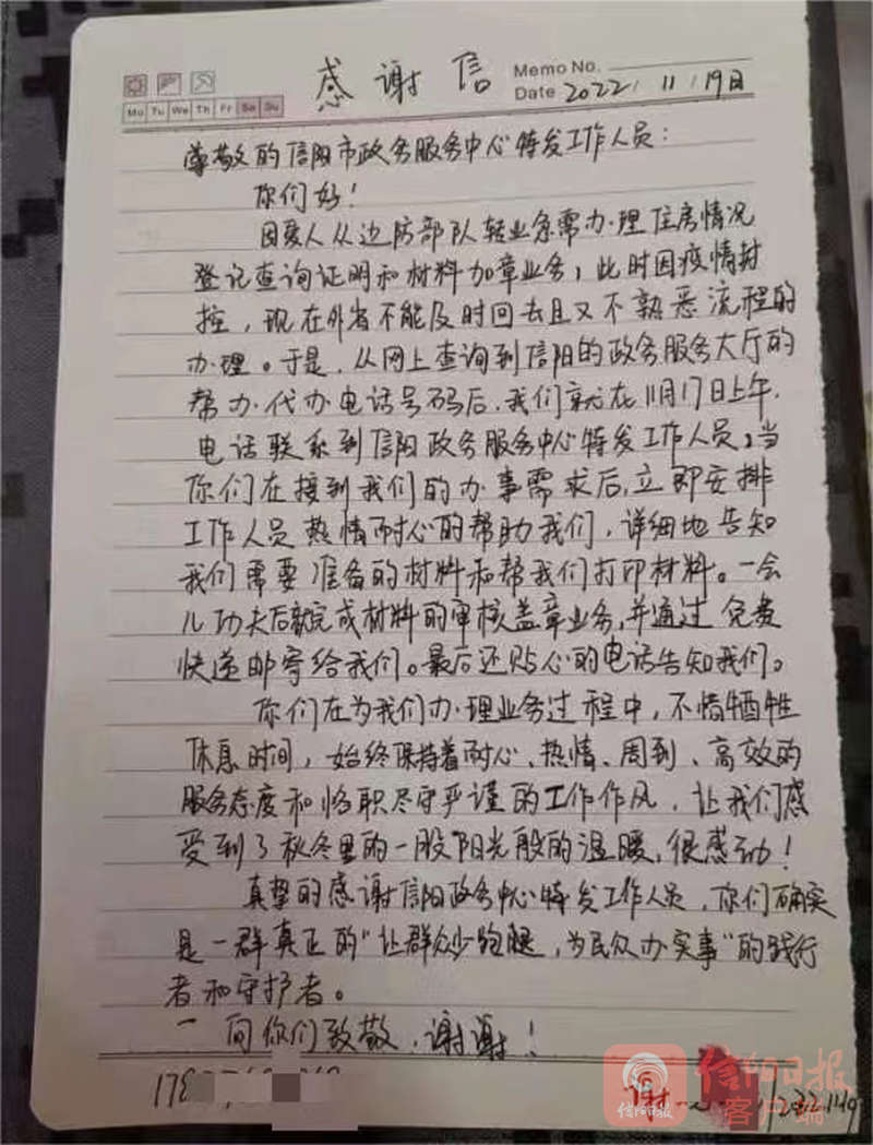 “真诚感谢信阳市政务服务中心工作人员!你们是一群真正的‘让群众少跑腿,为民众办实事’的践行者和守护者,向你们致敬!”昨日,市政务服务中心工作人员向记者展示一封来自安徽合肥的感谢信,手写体的信件字字真情暖人心。