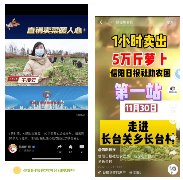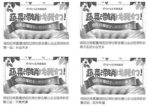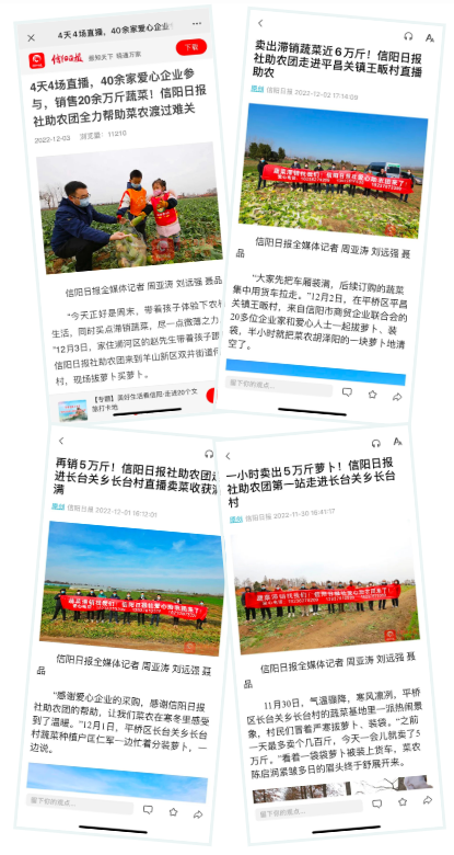 信阳日报社充分发挥报纸、客户端、网站、微信、新浪微博、抖音、视频号等全媒体平台的作用,做好蔬菜滞销的推介宣传,与爱心企业搭建产销对接信息平台,以实际行动帮助菜农解决销售难题。先后发起了《信阳日报社联合爱心企业现场助农第一站:长台关乡》《信阳日报社联合爱心企业现场助农再次走进长台关乡》《信阳日报社联合爱心企业现场助农第三站:平昌关镇》《信阳日报社联合爱心企业现场助农第四站:双井街道》《信阳日报社联合爱心企业现场助农第五站:尤店乡》5场直播;发布了《一小时卖出5万斤萝卜!信阳日报社助农团第一站走进长台关乡长台村》《再销5万斤!信阳日报社助农团走进长台关乡长台村直播卖菜收获满满》《卖出滞销蔬菜近6万斤!信阳日报社助农团走进平昌关镇王畈村直播助农》《4天4场直播,40余家爱心企业参与,销售20余万斤蔬菜!信阳日报社助农团全力帮助菜农渡过难关》《销售蔬菜10余万斤!信阳日报社助农团走进罗山县尤店乡李湾村直播助农》系列报道,每场直播观看数和文章阅读量均过万,相关视频阅读量超过10万。