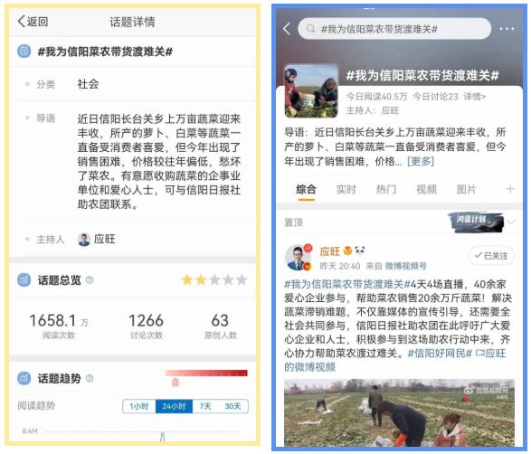 众人拾柴火焰高。为扩大爱心助农宣传影响力,信阳日报社主动吸引网络大V、爱心人士配合联动,众多信息报道共同转发,形成了传播声势。信阳日报社新媒体联合新浪微博大V@应旺发起#我为信阳菜农带货渡难关#公益助农活动,信阳本地大V@在信阳、@记录者一语、@在平桥、@旅游在信阳等积极参与话题,纷纷在官微发布或转发活动详情,助力农户销售蔬菜。截至12月8日,#我为信阳菜农带货渡难关#阅读量达1839万,成为新浪微博热门话题之一,其中@应旺话题发起微博的单条阅读量达到130万。