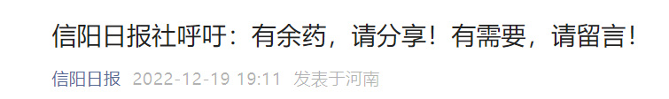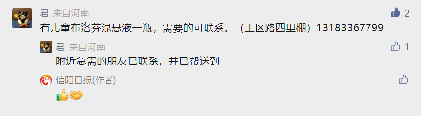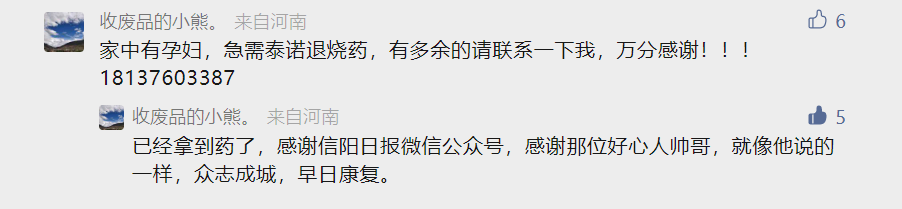 网友“收废品的小熊”在为家中有孕妇求得泰诺退烧药后表示:“感谢‘信阳日报微信公众号’的留言帮助,感谢那位好心人帅哥,就像他说的一样,众志成城,早日康复。”