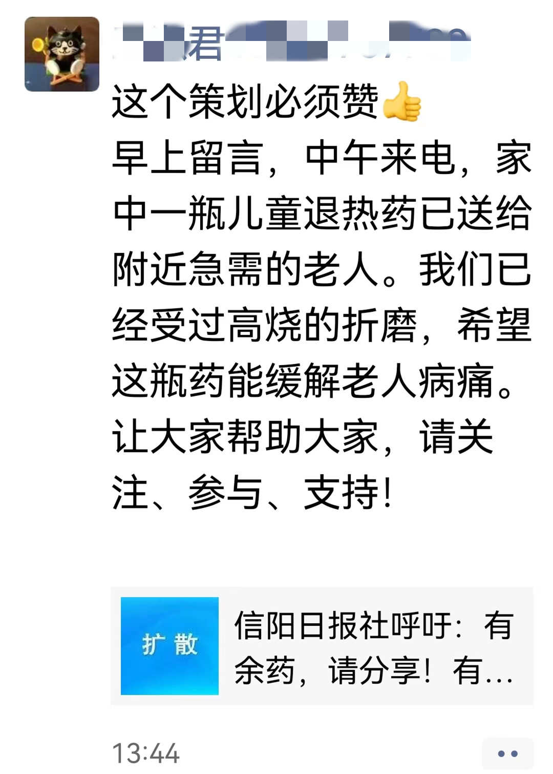 网友“君”表示:“这个策划必须赞!早上留言,中午来电,家中一瓶儿童退热药已送给附近急需的老人。我们已经受过高烧的折磨,希望这瓶药能缓解老人病痛。让大家帮助大家,请关注、参与、支持!”