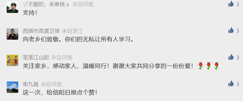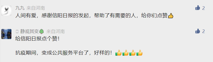 更有不少网友,“九九”“静观其变”“笔落江山起”“西湖市政龚卫坤”表示:“人间有爱,感谢信阳日报的发起,帮助了有需要的人,给你们点赞👍”“给信阳日报点个赞! 抗疫期间,发挥信阳官媒第一大号的作用,变身公共服务平台,好样的!