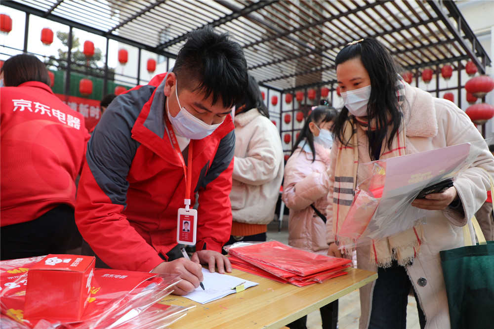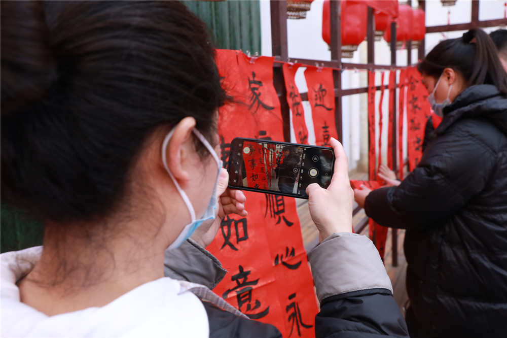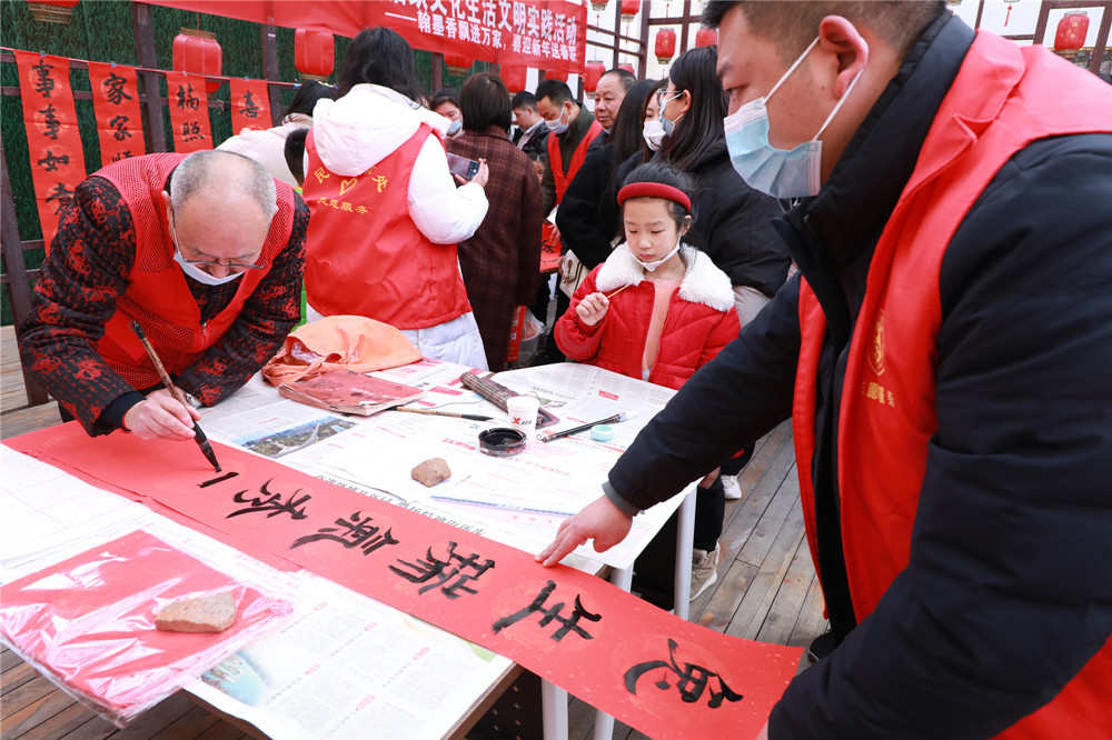 一副副透着喜庆、饱含祝福的春联挂在场地上,吸引无数市民围观和领取。精心书写的对联,由街道志愿者免费发放给市民,浓浓的新春氛围,一派喜气洋洋。活动现场,书法家们挥毫泼墨、奋笔疾书,爱心企业“京东电器”也给市民发放了“福袋”和精美礼品。