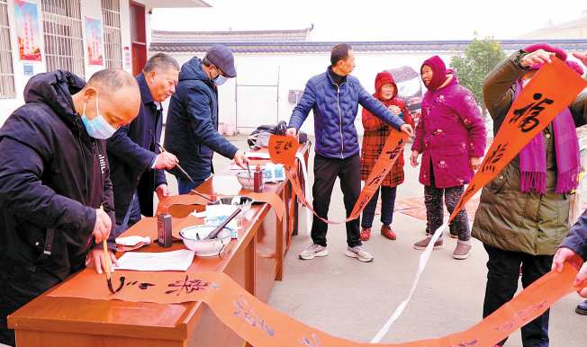 近日,光山县文广旅局、县图书馆等部门工作人员到十里镇代楼村开展“我们的中国梦 文化进万家”活动,现场为村民写春联、送图书,表达对乡亲们美好生活的祝福。