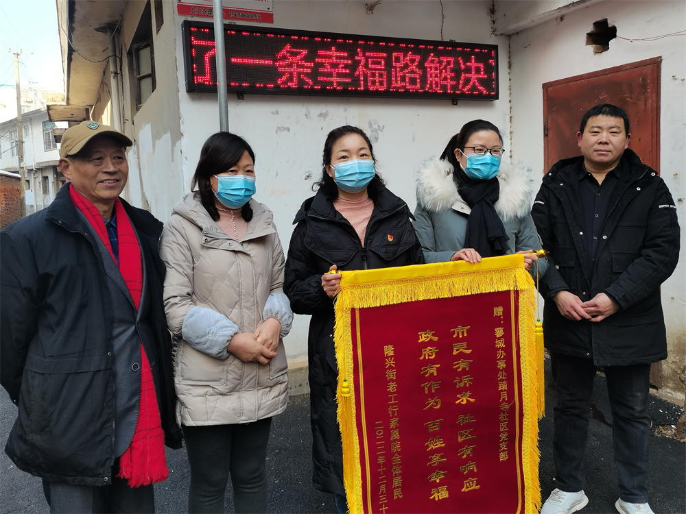 昨日,家住固始县城隆兴街老工行家属院的高玉斌,将一面印有“市民有诉求、社区有响应,政府有作为、百姓享幸福”的锦旗送到固始县蓼城街道踏月寺社区党支部书记胡勇的手中。