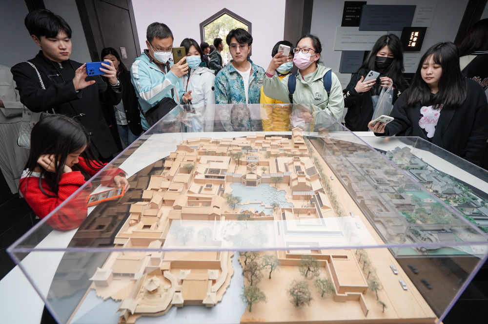 参观者在苏州博物馆观看苏州博物馆设计模型(2023年4月5日摄)。新华社记者 李博 摄
