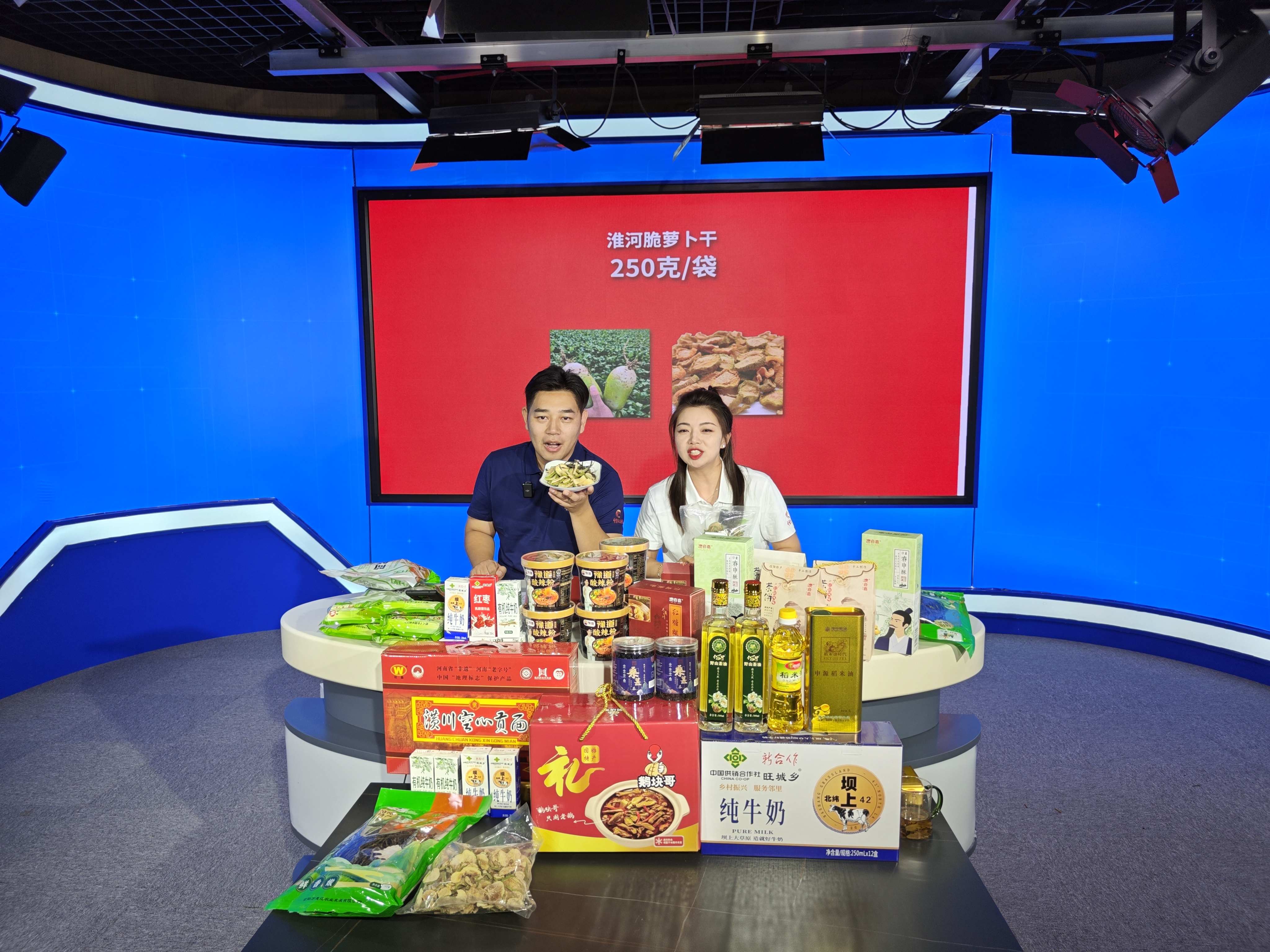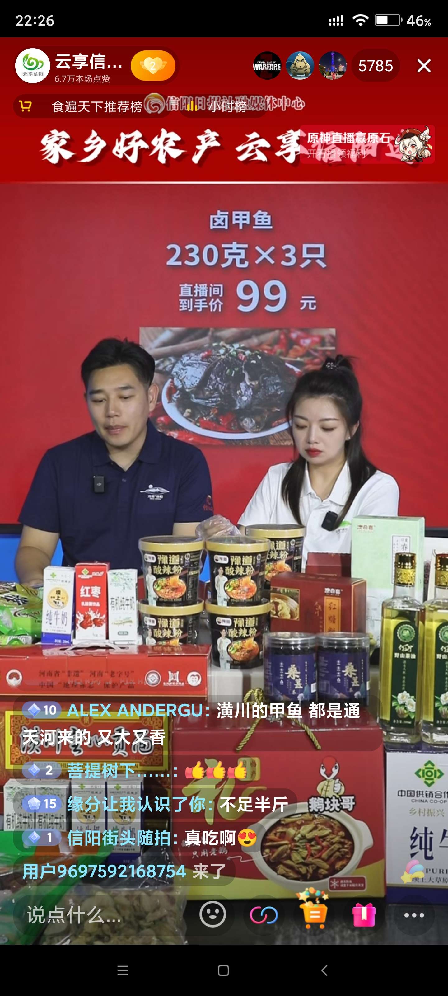 “这个干豆角怎么卖?”“潢川贡面不错,一定要买!”“这个固始鹅块我吃过,肉香汤鲜!”在直播间橱窗内,信阳本地优质农特产品吸引众多粉丝进入直播间问价、选购。