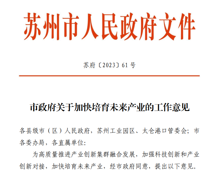 9月1日,苏州市政府出台《关于加快培育未来产业的工作意见》(以下简称《工作意见》)。贯彻落实创新驱动发展战略,高质量推进产业创新集群融合发展,加强科技创新和产业创新对接,前瞻谋划、培育发展苏州的未来产业,以此提升城市竞争新优势、构建现代化产业体系、打造具有全球影响力的产业科技创新中心主承载区。