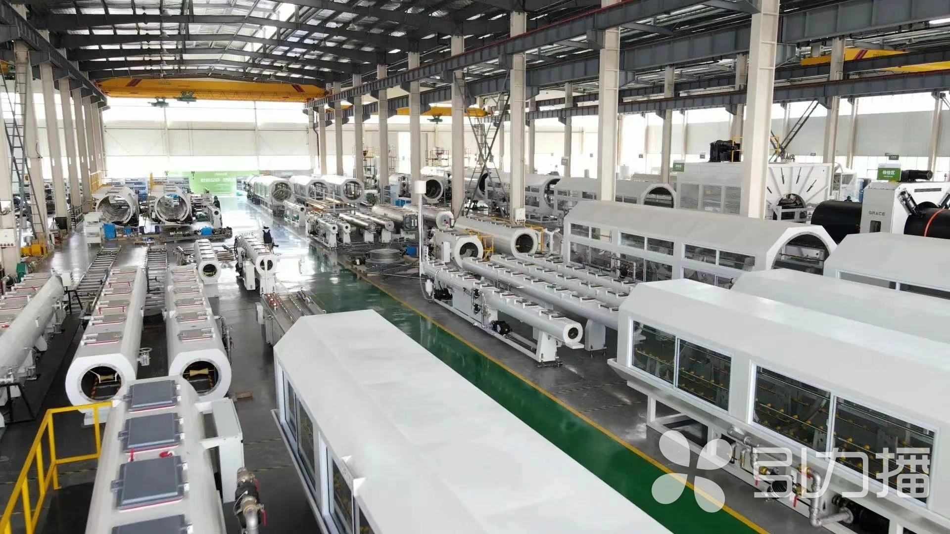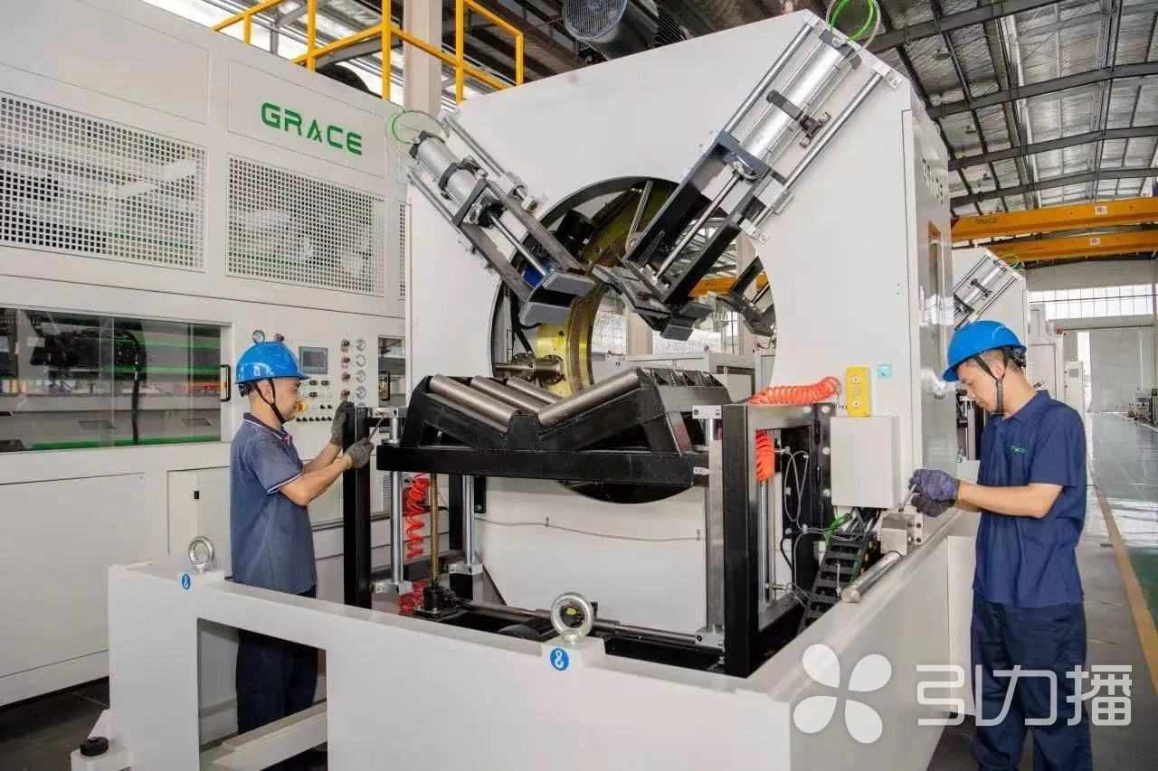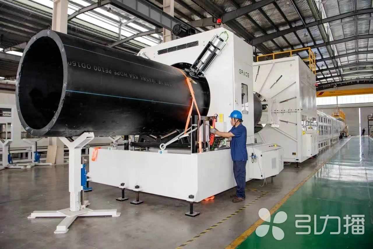 “管道口径越大,对管道挤出生产线的要求就越高,目前格雷斯机械制造的生产线,最大能制造2.6米口径的高密度聚乙烯实壁管道。”格雷斯机械技术总监余风强指着长长的生产线说,去年底,这条大口径管材挤出生产线投入使用,通过成熟的高速螺杆结构保障稳定运行,同时配备两台顶尖挤出机,能精准控制主机挤出量和管材米重。