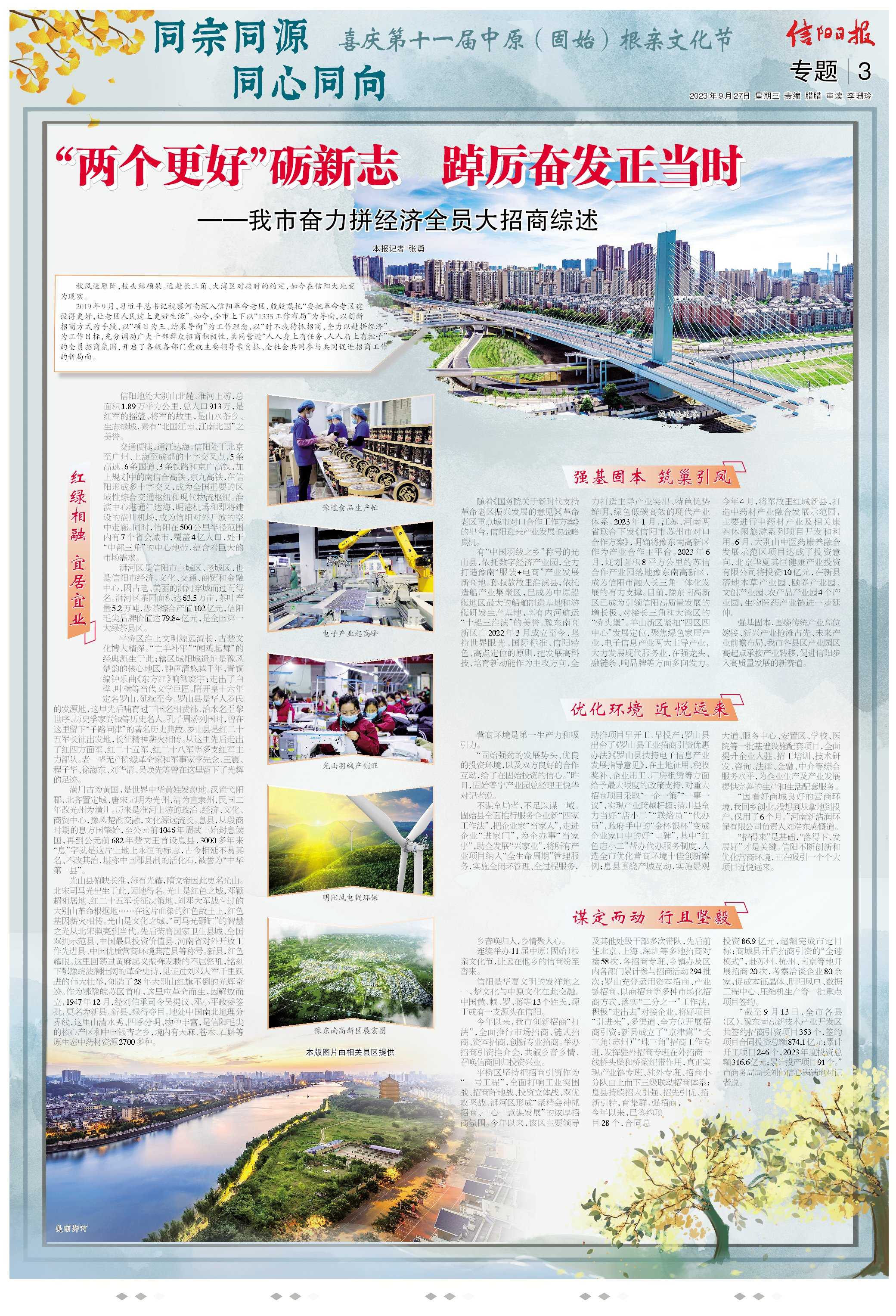 2019年9月,习近平总书记视察河南深入信阳革命老区,殷殷嘱托“要把革命老区建设得更好,让老区人民过上更好生活”。如今,全市上下以“1335工作布局”为导向,以创新招商方式为手段,以“项目为王、结果导向”为工作理念,以“时不我待抓招商,全力以赴拼经济”为工作目标,充分调动广大干部群众招商积极性,共同营造“人人身上有任务,人人肩上有担子”的全员招商氛围,开启了各级各部门党政主要领导亲自抓、全社会共同参与共同促进招商工作的新局面。