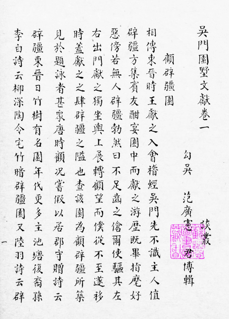 《吴门园墅文献》约完成于20世纪50年代,此书外,范君博还撰写了《红兰逸韵》《苏州实录吟钞》《吴门坊巷待鞧吟》等多本方志类作品。