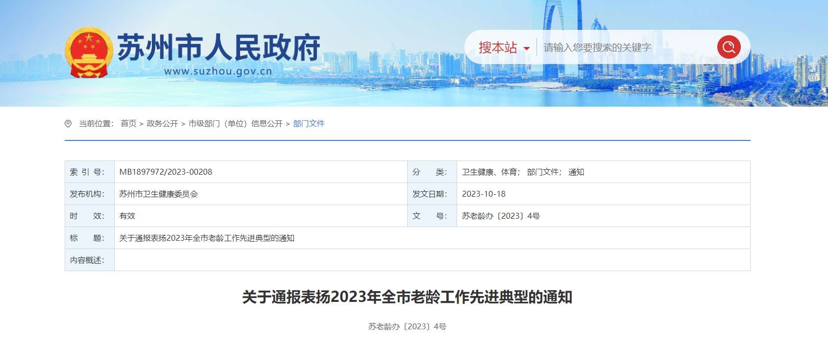 近日,苏州市老龄工作委员会办公室发布通知,通报表扬2023年全市老龄工作先进典型。全市共有30人上榜,分别获评2023年度“苏州敬老之星”“苏州老有所为之星”“苏州老年健康达人”。
