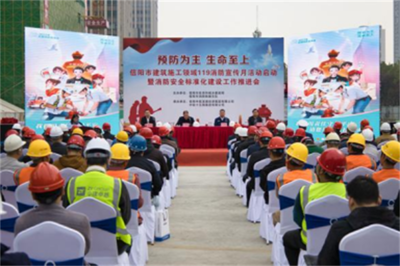11月9日上午9时,信阳市消防救援支队联合市住建局在信阳市综合公共卫生应急服务中心项目工地组织召开全市建筑施工领域119消防宣传月活动启动暨消防安全标准化建设活动现场会,同时开展消防宣传咨询、灭火应急联合演练活动。市消防救援支队副支队长王秀春、市建设工程质量安全技术站站长马其峰出席活动并讲话。市中心城区各施工单位项目经理、安全生产经理、项目总监、专职安全员及部分消防指战员代表参加会议。