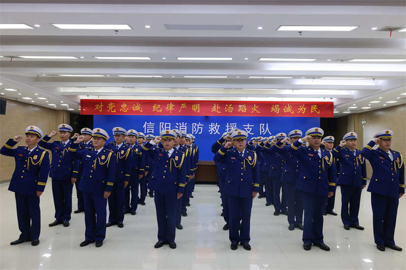 11月8日下午,在习近平总书记向国家综合性消防救援队伍授旗致训词五周年之际,信阳市消防救援支队同步开展重温重要训词和入队誓词活动。(张琦)
