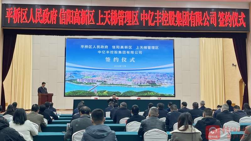 11月16日,平桥区政府、信阳高新区、上天梯管理区与中亿丰控股集团有限公司战略合作签约仪式在市行政中心举行。市委常委、秘书长杨进致辞。市人大常委会副主任、信阳高新区党工委第一书记李灵敏主持签约仪式。中亿丰控股集团有限公司总裁曾成武介绍项目情况。