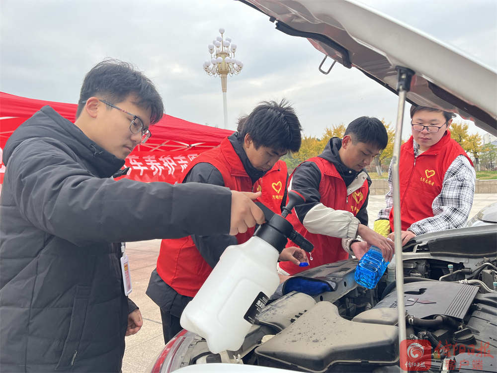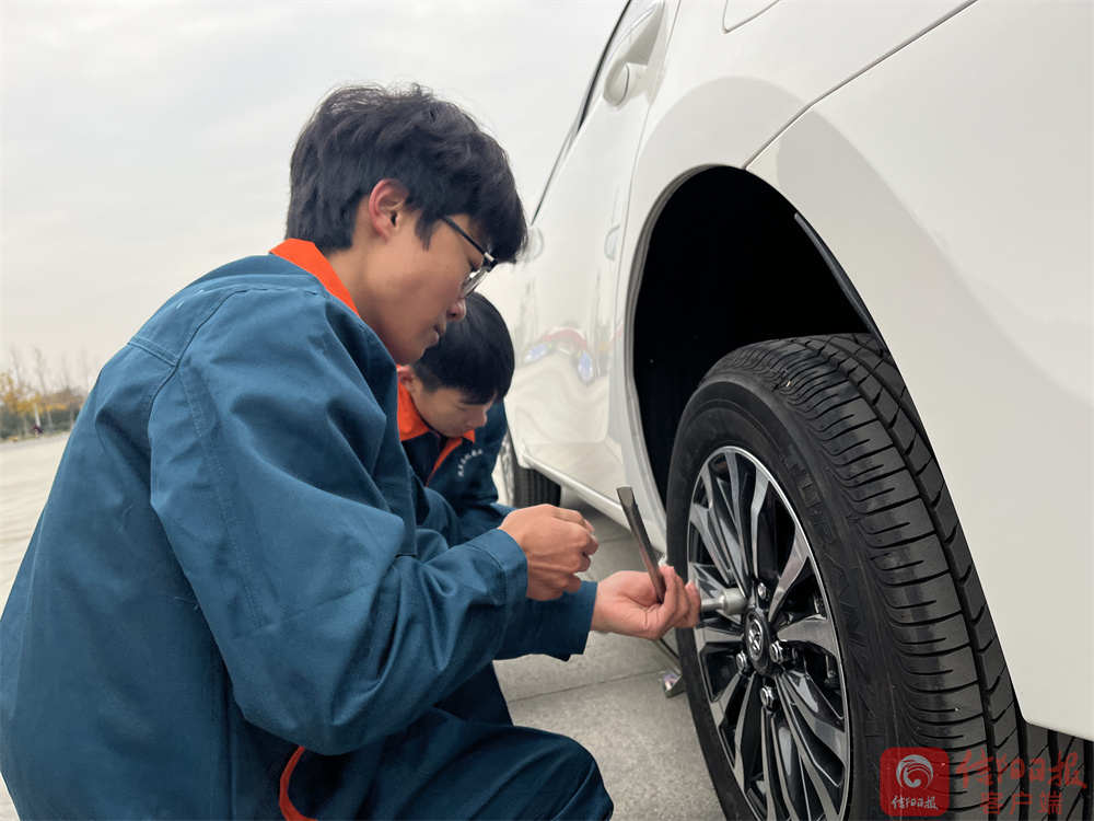 “预备,现在开始计时!”11月25日,在信阳职业技术学院明德广场,汽车备胎更换大赛引来了众多市民、师生的驻足观看。只见三组选手同时进行备胎更换比赛,选手们两两配合,完成整个更换流程,裁判老师们以完成操作时间长短判定分数……