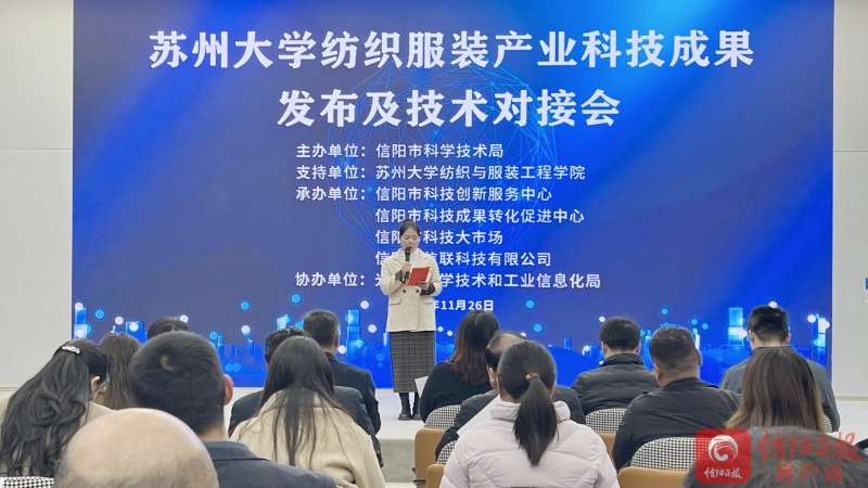 11月26日上午,苏州大学纺织服装产业科技成果发布及技术对接会在我市举行。苏州大学专家学者、我市科技系统相关负责同志以及全市重点纺织服装企业代表参加活动。