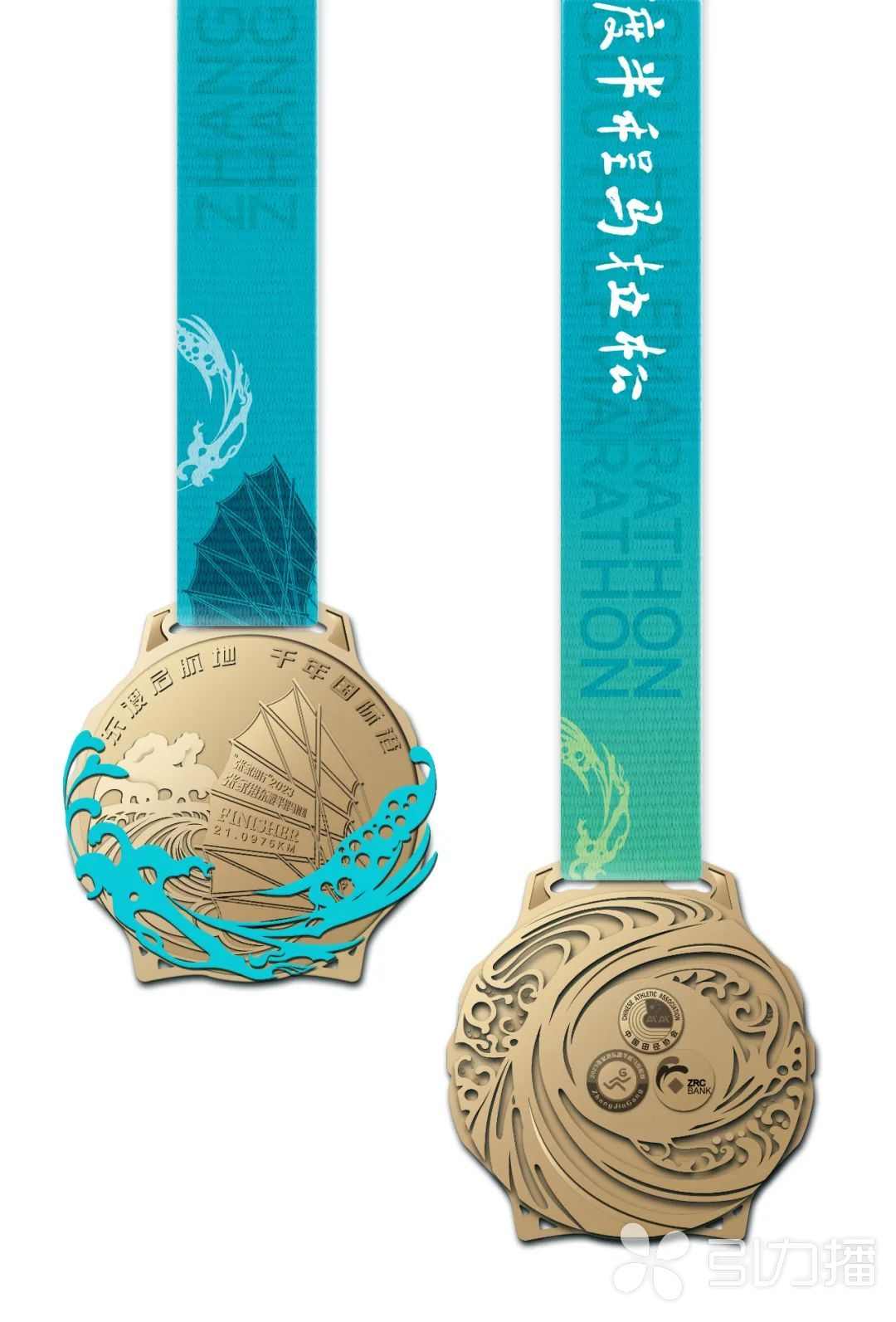 奖牌设计以浪花为主元素,将浪花的激情、力量与马拉松精神相结合,旨在展现马拉松运动员的奋斗精神和张家港的城市凝聚力。同时融合东渡帆船元素,借此展现张家港东渡文化与长江文化,彰显“东渡启航地,千年国际港”悠久的历史文化与城市人文智慧。