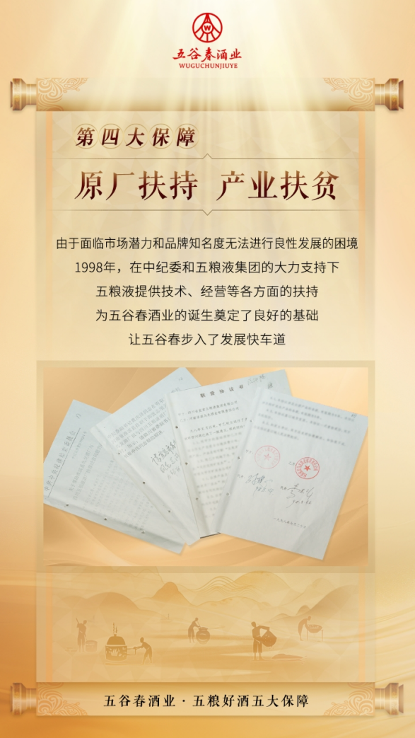 1998年11月,在中纪委监察部机关扶贫办和驻淮扶贫工作组的关怀和支持下,在五粮液集团的真诚帮助下,乌龙酒业实现了与五粮液集团的品牌联营,企业步入了发展快车道,充分彰显了五粮液集团的政治与社会责任担当,为五谷春酒业的诞生奠定了良好的基础,为淮滨县经济社会发展做出了突出贡献,一跃成为全市重点企业和全省轻工业行业优秀企业。
