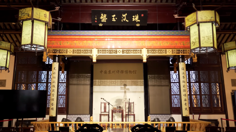 每个假日的傍晚,平江路华灯初上,小桥流水、老墙石堤、深宅远巷,在灯火摇曳中如梦如幻,令游人不自觉地放慢了脚步。拐入中张家巷,中国苏州评弹博物馆在夜幕的映衬下更显古朴,馆内虽不似白天的熙熙攘攘,却另有一番韵味。