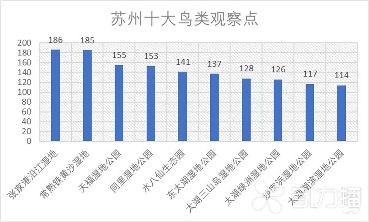 近几年,苏州记录到的鸟类数量快速增加,这里俨然成为了名副其实的“鸟类天堂”。对比过去一年的观测数据,苏州最新的最佳观鸟胜地,即鸟种丰富度最高的3处地方依次为:张家港沿江湿地、常熟铁黄沙湿地、天福湿地公园。