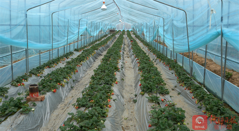 近日,记者走进新县吴陈河镇龚洼村草莓温室大棚,只见一垄垄碧绿的草莓植株整齐排列,一颗颗饱满红润的草莓掩藏在其中,散发着甜蜜诱人的香气。