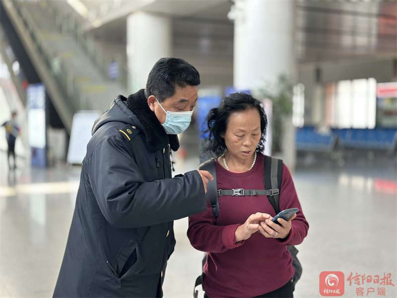 “来我来帮您拎行李。”“这趟车在二楼候车,乘坐电梯时站稳,注意安全。”……老高是信阳车站信阳站客运值班员高付安,2月11日,大年初二,上午9时许,记者在信阳站见到了忙前忙后的老高。“我曾在部队服役14年,32岁从部队转业至信阳站工作的,之后的每年春运我都在岗。”老高说。