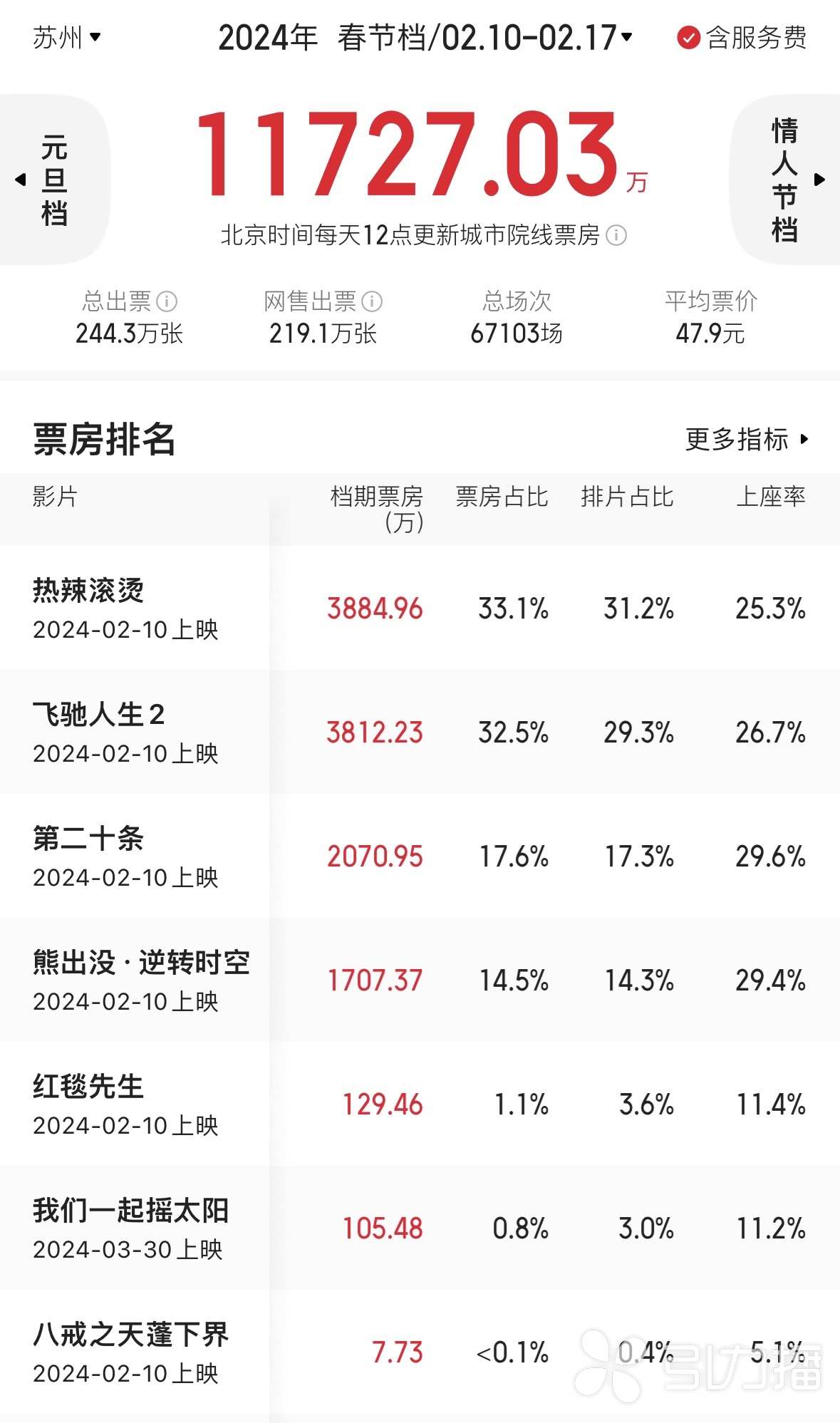 毫无意外地,这个春节档(2月10日至2月17日),苏州电影市场票房又双叒叕领跑全省,列全国第九。