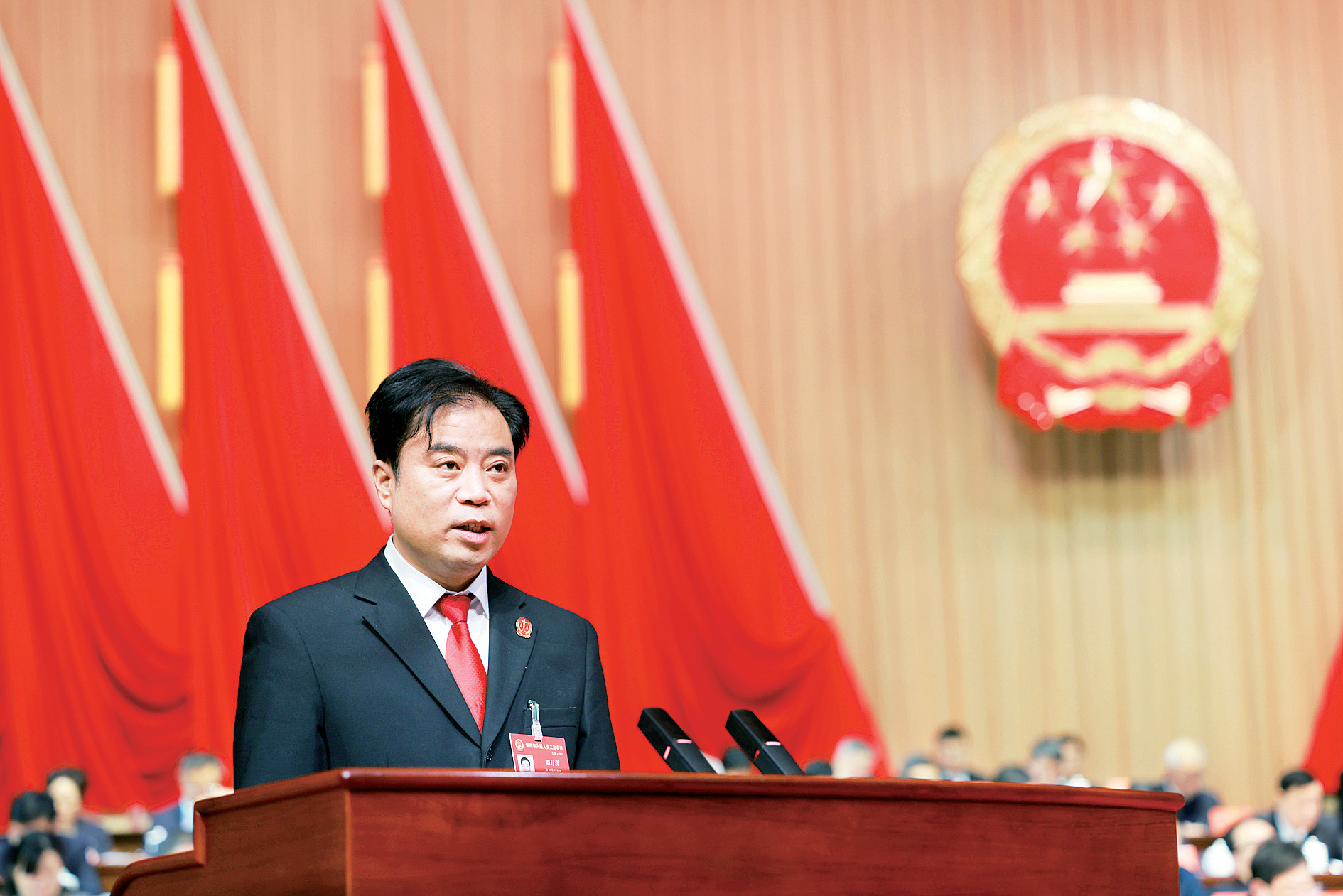 2月22日,信阳市中级人民法院党组书记、院长刘万喜在市六届人大二次会议上作信阳市中级人民法院工作报告。记者 孙浩然 摄