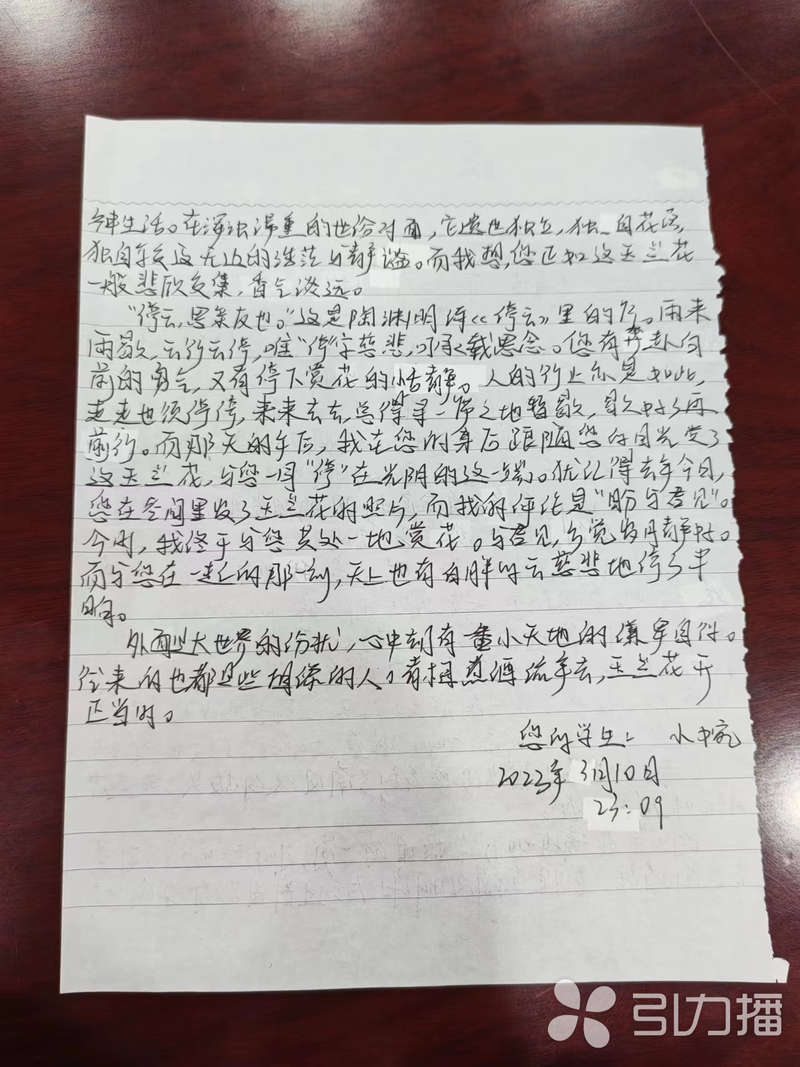 “今年3月3日,春雨淅沥,万物复苏。我的现任课代表小周同学转给我一封信,说是高三李学姐委托她转交我的并叮嘱她很多话,有些交接的仪式感。信里写的是对自己参加春季高考选择的勇敢与坚持的满满自信。‘弯道超车,殊途同归’一句醒目在行,这是我以前对她说过的话。”