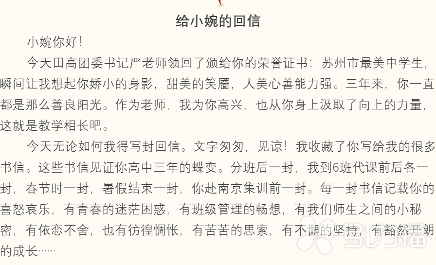 “田老师就如同美好的玉兰花,她是我人生的引路灯,也是无法定义的一束光。”最近,苏州市田家炳实验高级中学高三(6)班学生小婉刚结束春季高考,她收到田高教师田周的回信后,满怀感激之情回到学校,感谢田老师的细心关爱与鼓励支持。